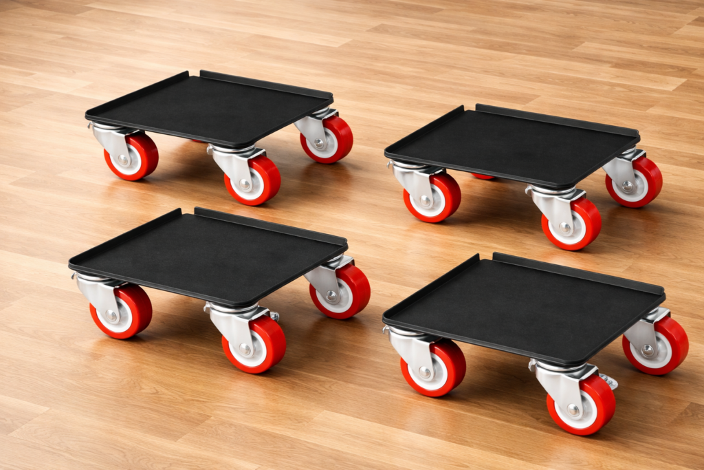 Wózki do transportu mebli. Małe, ale za to niezawodne. Z łatwością przewiozą ciężką szafę, czy biurko. Z uwagi na pełne gumowe koła nie rysują podłogi.